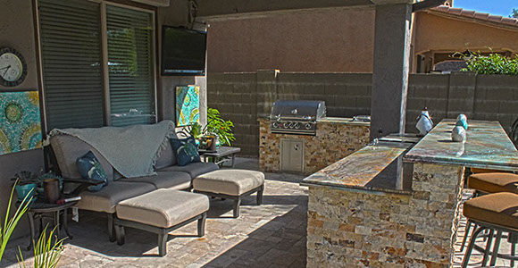 An outdoor masonry kitchen adds textural interest to any outdoor gathering space, especially when built with stone materials. We can take cues from the architecture of the house, and shape your outdoor kitchen to create a focal point for your outdoor living space. With an outdoor kitchen you can prepare meals and your guests can enjoy the beauty of your kitchen/barbecue area.